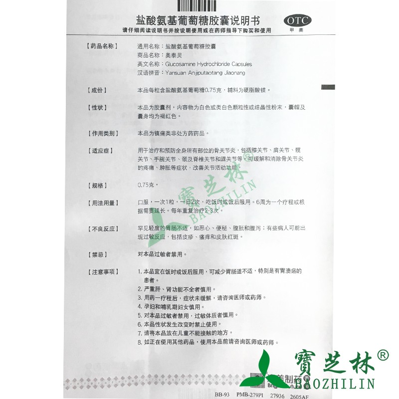 奧泰靈 鹽酸氨基葡萄糖膠囊 0.75g*10粒